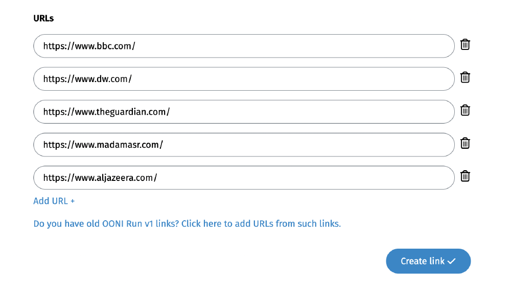 Step 6. Click Create Link to create a new OONI Run v2 link based on the URLs of your old OONI Run v1 link.