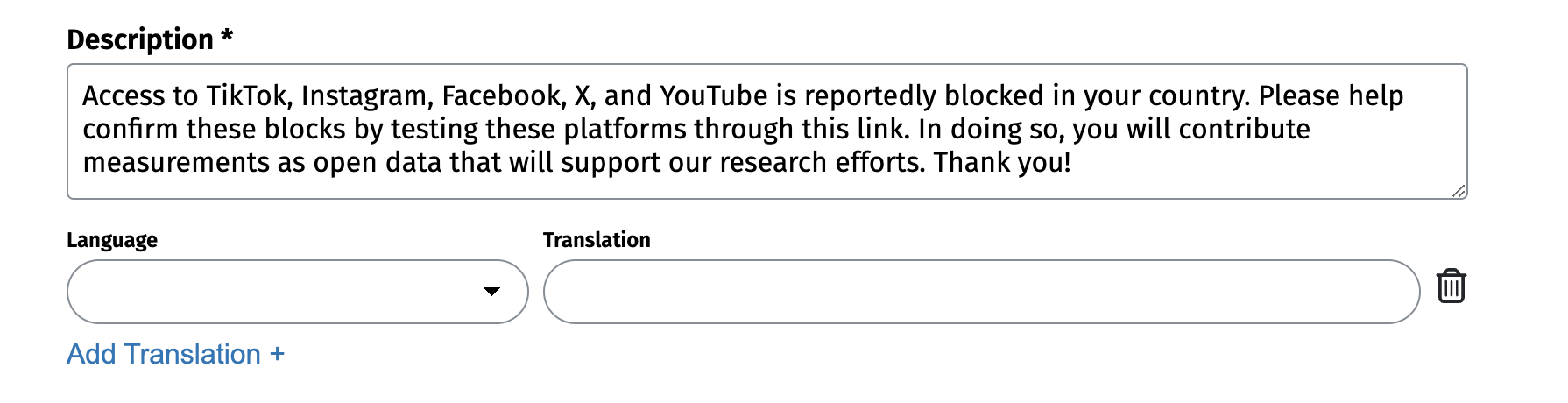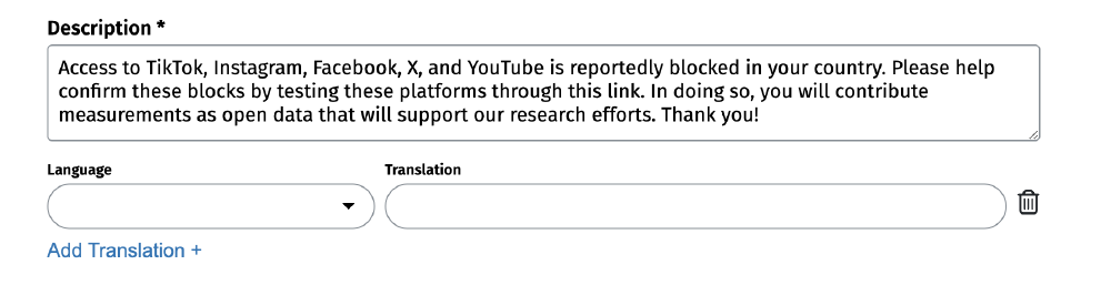 Step 7. Add a (longer) description for your OONI Run link. This is an opportunity to communicate details about the testing, and why it’s important. Optionally, you can add translations.