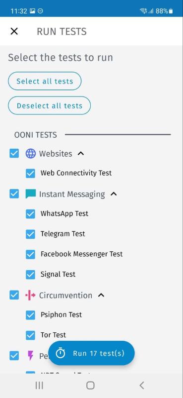 In the event that you have disabled automated OONI Run link testing and would like to manually test websites included in your OONI Run link, you can do so by tapping the main “Run” button in the OONI Probe Dashboard, tapping the “Deselect all tests” button (to deselect all other OONI Probe tests), and by only enabling the OONI Run link test.