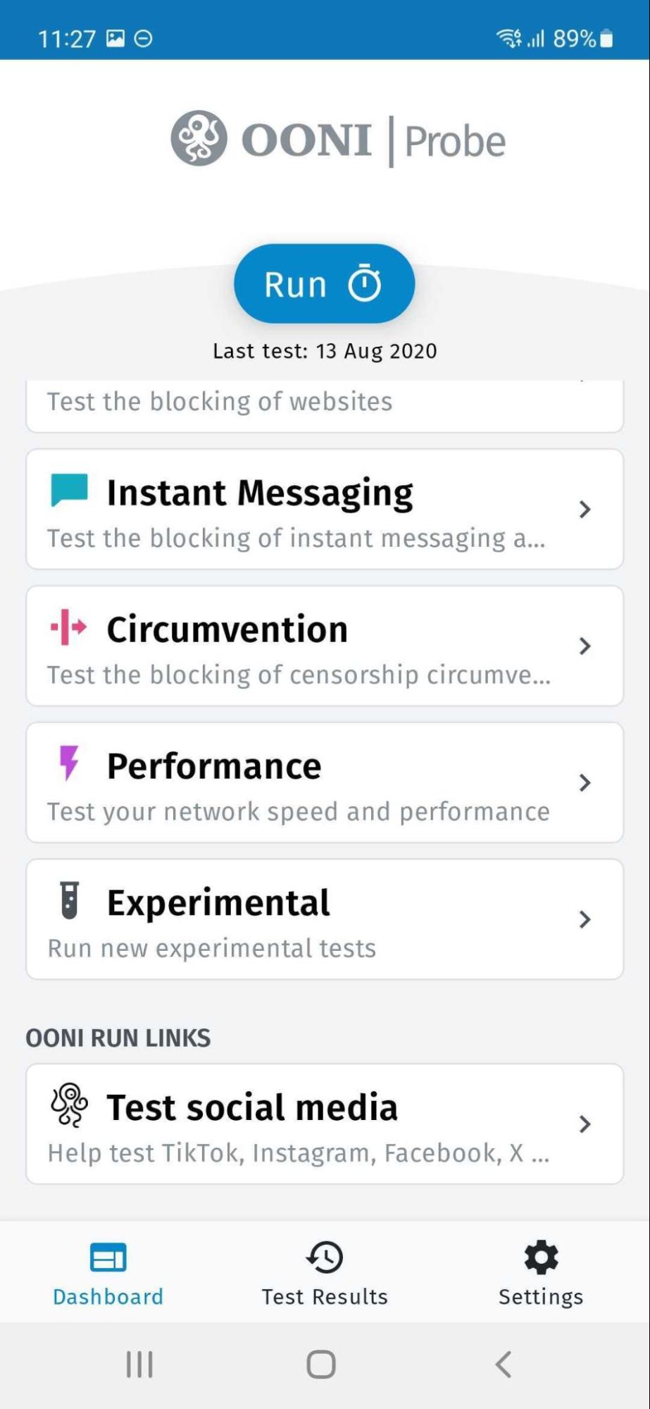 As you may have noticed through the previous section, we introduced UI changes to the OONI Probe Android app with the launch of OONI Run v2. We made these changes in order to accommodate introducing OONI Run link cards in the OONI Probe mobile app.