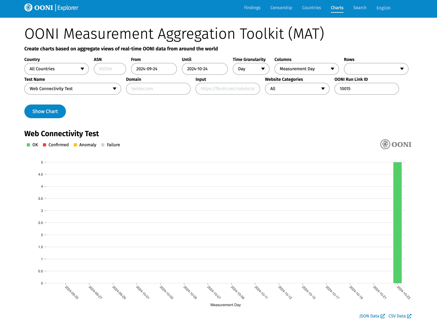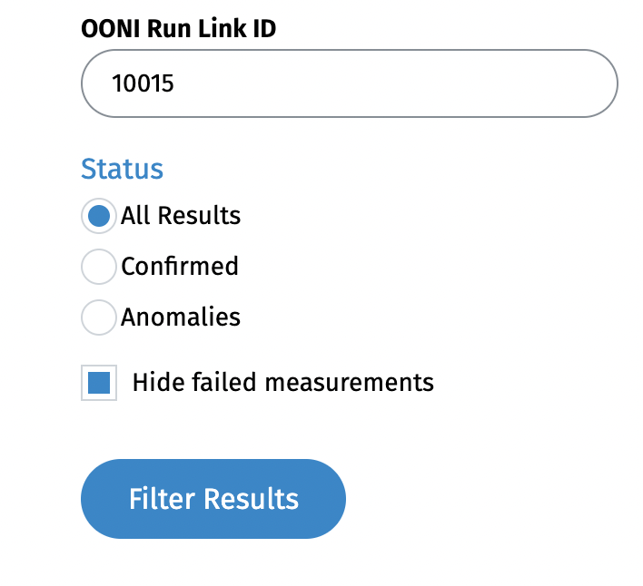 We are excited to share that you can now easily find and aggregate measurements from your specific OONI Run v2 link through OONI Explorer! Specifically, you can filter measurements in both the OONI Explorer Search Tool and Measurement Aggregation Toolkit (MAT) based on the ID of your OONI Run v2 link (“OONI Run Link ID”).